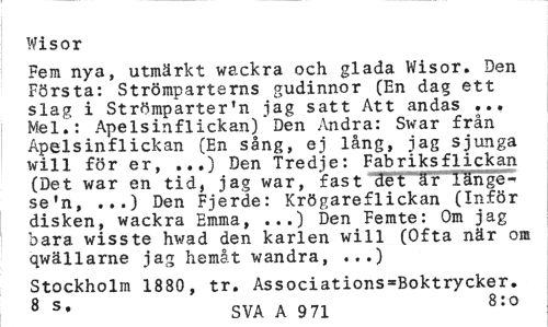 //// Wisor //// Fem nya, utmärkt wackra och glada Wisor. Den Första: Strömparterns gudinnor (En dag ett slag i Strömparter'n jag satt Att andas ... Mel.: Apelsinflickan)" Den Andra: Swar från Apelsinflickan (En sång, ej lång, jag sjunga will för er, ...) Den Tredje: Fabriksflickan (Det war en tid, jag war, fas t iet är Tänge-se'n, ...) Den Fjerde: Krögareflickan (Inför disken, wackra Emma, ...) Den Femte: Om jag bara wisste hwad den karlen will (Ofta när om qwällarne jag hemåt wandra, ...) //// Stockholm 1880, tr. Associations=Boktrycker. //// 8 s* SVA A 9 71 8:0 ////