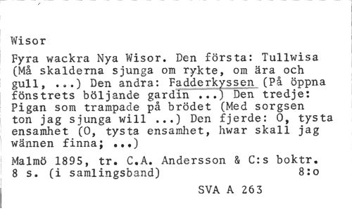 //// Wisor //// Fyra wackra Nya Wisor. Den första: Tullwisa (Må skalderna sjunga om rykte, om ära och gull, ...) Den andra: Fadderkyssen (På öppna fönstrets böljande gardin 777) Den tredje: Pigan som trampade på brödet (Med sorgsen ton jag sjunga will ...) Den fjerde: 0, tysta ensamhet (0, tysta ensamhet, hwar skall jag wännen finna; ...) //// Malmö 1895, tr. C.A. Andersson & C:s boktr. 8 s. (i samlingsband) 8:o //// SVA A 26 3 ////