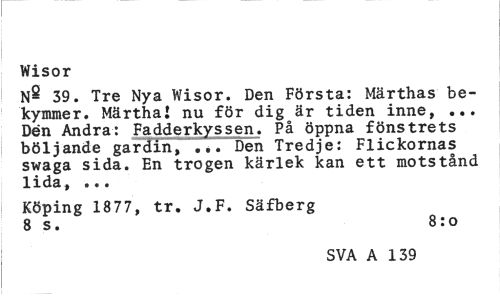 //// Wisor //// N- 39. Tre Nya Wisor. Den Första: Märthas bekymmer. MärthaJ nu för dig är tiden inne, ... Den Andra: Fadderkyssen. På öppna fönstrets böljande gardin, ..."Den Tredje: Flickornas swaga sida. En trogen kärlek kan ett motstånd lida, ... //// Köping 1877, tr. J.F. Säfberg 8 s. 8:o //// SVA A 139 4 ////