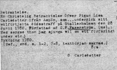 //// Betraktelse. //// En Christelig Betracktelse Öfwer Pigan Lisa Carlotter ifrån Aspönt »cm.. .undergick sitt wälförtjenta dödsstraff på Ställerhelmen den 28 Jurii 1780. författad af G.F.Fagerström. (mel.; jMed sorgse thon jag sjunga wi 1 om ** e 11 fö rfärl i gt under etc.) Fykcping 1780. (Def., end. s. 1-2, 7-8, textbörjan saknas.) //// r :m ' ' //// 0 Carlsdetter //// t <. » , ' • * ' •": ' ¦ ^ V' ////