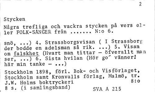 //// 2 //// Stycken //// Några trefliga och vackra stycken på vers eller FOLK-SÅNGER från ... N:o 6. //// snö, ...) 4. Strassborgsvisan ( I Strassborg der bodde en adelsman så rik. ...) 5. Visan om falskhet (Hvart man tittar - öfverallt man ser,""...) 6. Sista hvilan (Hör go" vänner! här min tanke - ...) //// Stockholm 1898, förl. Bok- och Visförlaget, Stockholm samt Kronvalls förlag, Malmö, tr. J.W. Holms boktryckeri 8:o //// 8 s. (i samlingsband) cVA . ////