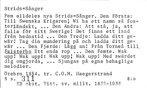 //// Strids=Sånger //// Fem alldeles nya Strids=Sånger. Den Första; Till Swenska Krigaren} Wi ha ett namn så fosterländskt, ... Den Andra: Att stå, ja, att falla för sitt Swerige! Det finns ett land från hednatid ... Den Tredje: Ladda ditt ge-wär! Tag din mundering på och ladda ditt gewär ... Den Fjerde: Lägg an! Från Torneå till Falsterbo Ett enda rop ... Den Femte. Wak upp! Wak upp!: Wak uppj Wak upp! Med swärdet dig omgjorda, ... Sjungas på egna behagliga melodier. //// Örebro 1854. tr. C.O.M. Haegerstrand 8 s. 311 8:o //// KB okat. Vitt. sv. milit. 1835-1938 ////