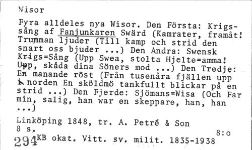 //// Wisor 1 //// Fyra alldeles nya Wisor. Den Första: Krigssång af Fanjunkaren Swärd (Kamrater, framåt i Trumman ljuder (Till kamp och strid den snart oss bjuder ...) Den Andra: Swensk Krigs=Sång (Upp Swea, stolta Hjelte=ammaJ Upp, skåda dina Söners mod ...) Den Tredje: En manande röst (Från tusenåra fjällen upp k norden En sköldmö tankfullt blickar på en strid ...) Den Fjerde: Sjömans=Wisa (Och Far min, salig, han war en skeppare, han, han • • •) //// Linköping 1848, tr. A. Petré & Son 8 s, 8:0 //// oq*KB okat. Vitt. sv. milit. 1835-1938 ////