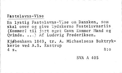 //// Fastelavns-Vise //// En lystig Fastelavns-Vise om Dansken, som skal over og give Tydskerne Fastelavnsriis (Kommeri til jert eget Gavn Kommer Mand og Qvinde. ..o) Åf Ludevig Frederiksen. //// Kjtfbenhavn 1849, tr. A. Michaelsens Boktryk-kerie ved A.S. Kastrup //// 4 s» 8:0 //// SVA A 405 ////