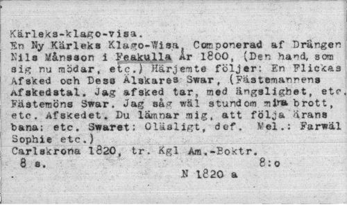 //// Kärleks-klago-visa. //// TSn Ny Kärl ek a Klago-^isa Coffiponerad af .Drängen Kila Månsson 1 Feakulla År 1800, (Den ha*d, som sig nu raödar, etc.)* Kärjemte följer: En Flickas Afsked och Dess Älskares 3*ar, (Fästemanren» Afakedstal. Jag afsked tar, med ängslighet, etc Fästemöns Swar. Jag såg wäl stundom mina brott, etc. Afskedet. Du lämnar mig, att följa ärans bana; etc. Swaret: Oläsligt, def. Mel„: Farwäl Sophie etc.) //// Carlskrona 1820, tr. Kgl Am.-Boktr. 8 s. 8: o //// JN 1820 a ////