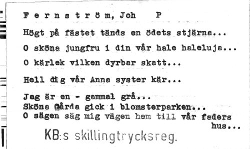 //// 1 Fernström, Joh P //// | Högt på fästet tänds en ödets stjärna... 0 sköna jungfru i din vår hale haleluja... 0 kärlek vilken dyrbar skatt... //// | Hell dt g vår Anna syster kär... //// Jag är en - gammal grå... //// - Sköns Qårda giok i blomsterparken... //// = 0 sägen säg mig vägen hem till vår faders //// - hus... //// KB:S skillingtrycksreg. ////