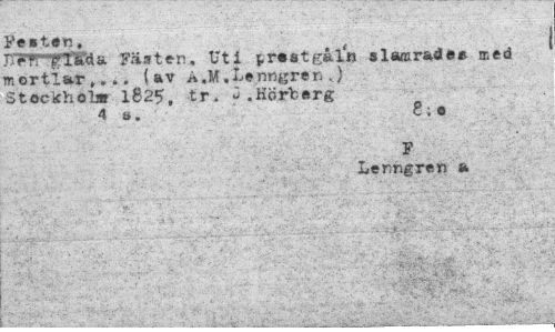 //// Festen, //// CTK "glTTda Fästen, Uti jrestgåln slamrade* med mortlar,... (av A,M,Ltnngren .) Stockholar 1825, tr. 3 .Hörberg //// 4 ä». 8; e //// " ; ¦ ' ' " • • 5 ' v.{ //// Lenngren a ////