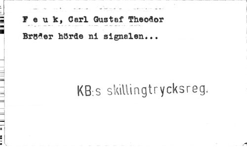 //// j -... //// ¦ F e u k, Carl Gustaf Theodor i //// Bröder hörde ni signalen... //// i //// J i //// l KB.s skiilingtrycksreg. //// i, /¦ ////