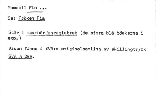 //// Mamsell Fia ... Se$ Fröken Fia //// Står i fcextbör.janreqistret (de stora blå böekema i exp,^) //// Visan finns i Sl/Ass originalsamling av skillingtryck SVA A 269. ////