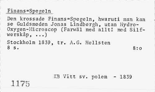 //// Finans=Spegeln //// Den krossade Finans=Spegeln, hwaruti man kan se Guldsmeden Jonas Lindbergh, utan Hydro-Oxygen-Microscop (Farwäl med allt I med Silf-werskåp, .».) //// Stockholm 1839, tr. A.G. Hellsten 8 s. 8:0 //// KB Vitt sv. polem - 1839 //// 1175 ////