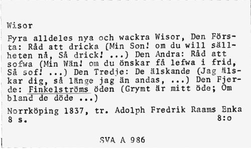 //// Wisor //// Fyra alldeles nya och wackra Wisor, Den Första: Råd att dricka (Min Son.' om du will säll-heten nå, Så drick.' ...) Den Andra: Råd att sofwa (Min Wäni om du Önskar få lefwa i frid, Så sofi ...) Den Tredje: De älskande (Jag älskar dig, så länge jag än andas, ...) Den Fjerde: Finkelströms öden (Grymt är mitt öde; Om bland de döde ...) //// Norrköping 1837, tr. Adolph Fredrik Raams Enka 8 s. " 8:o //// [ SVA A 9 86 ////