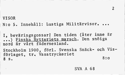 //// 2 //// VISOR //// N:o 5. Innehåll: Lustiga Militärvisor. ... //// I, beväringsgossarI Den tiden (åter inne är ...) Finska Rytteriets marsch. Den snöiga nord är vårt fädernesland. //// Stockholm 1900, förl. Svenska Snäck- och Visförlaget, tr. Vasatryckeriet 8 s. 8:o //// SVA A 68 8 ////