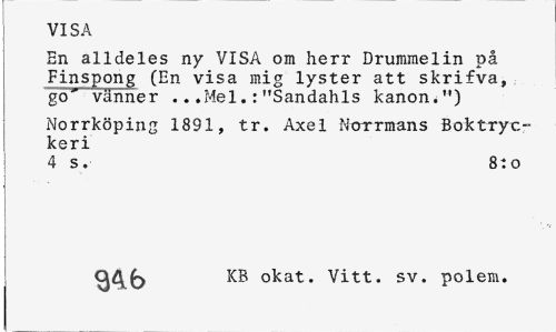 //// VISA //// En alldeles ny VISA om herr Drummelin på Finspong (En visa mig lyster att skrifva, go" vänner ...Mel.:"Sandahls kanon.") //// Norrköping 1891, tr. Axel Norrmans Boktryckeri //// 4 s. 8:0 //// okat. Vitt. sv. polem. ////