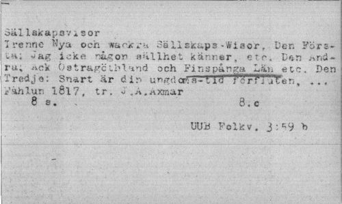 //// Sällskapavisor //// Irerme Nya och wackra Sällskaps*Wisort Den yörs-uh; Jag icke någon aällhet känner, etc. Dsn Andra; Ack östragcthland och Finspånga Lat> etc. Den Tredje: Snart är dir- ungdcrié-ti<J rcrfjuren, ... Fahlun 1817, tr, J.A.Axmar //// 8 s. 8. c //// UUij Folk v. 3:^9 b ////