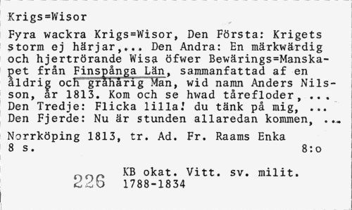 //// Krigs=Wisor //// Fyra wackra Krigs=Wisor, Den Första; Krigets storm ej härjar,... Den Andra: En märkwärdig och hjertrörande Wisa öfwer Bewärings=Manska-£et från Finspånga Län, sammanfattad af en aldrig och gråhårig Man, wid namn Anders Nilsson, år 1813. Kom och se hwad tårefloder, ... Den Tredje: Flicka lilla.' du tänk på mig, ... Den Fjerde: Nu är stunden allaredan kommen, //// Norrköping 1813, tr. Ad. Fr. Raams Enka 8 s . 8: o //// KB okat. Vitt. sv. milit. ddb 1788-1834 ////