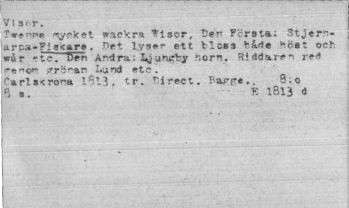 //// Visor. //// Tt»we ¦Tycket wackra Wisor, U«'rr Fcrsta; Stjern-arpa-Fiskare. Det lyser ett blcs3 bårfe höst och war etc. Pen Andra: Ljungby horn. Riddaren red ^"or grö nar Lund etc. //// Carls-trona 1$13 , tr. ^irect. Bagge., 8:0 6 a. K 1813 d ////
