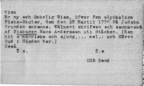 //// Visa //// En ny och Ömkelig Wisa, öfwer Fem olyckeliga Fiske-Skutor, Som den 28 Martii 177* På Judska Grunden emkommo, Wälment skrifwen och samman saft Af Fiskaren Hans Andersson uti Stacken. (Kom hit o människa och sjung,;., mel. i Ach HErre Gud i Högden hor,) Uoeå //// t s, 8:o //// UUB Bond ////