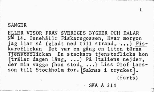 //// 1 //// SÅNGER //// ELLER VISOR FRÄN SVERIGES BYGDER OCH DALAR N- 14. Innehåll: Fiskaregossen, Hvar morgon jag ilar så (gladt ned till strand, ..*) Fiskareflickan Det var en gång en liten tärna T} e n s t eTITcTc an En stackars t jens te flicka hon (trälar dagen lång, ...) På Italiens nejder, der min vagga (hon stod, ...) Liss Olof Larsson till Stockholm for. [Saknas i trycketj. //// (forts) //// SVA A 769 2 ////