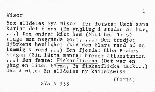//// 1 //// Wisor //// Sex alldeles Nya Wisor Den första: Usch såna karlar det finns (En yngling i staden är här, ...) Den andra: Mitt hem (Mitt hem är så ringa men naggande godt, ...) Den tredje: Björkens hemlighet (Wid den klara rand af en lummig strand ,..) Den fjerde: Ebba Brahes klagan (Sin lätta mantel breder aftonstunden ...) Den femte: Fiskarflickan (Det war en gång en liten tärna, En fiskarflicka täck...) Den sjette: En alldeles ny kärlekswisa //// (forts) //// SVA A 9 33 ////