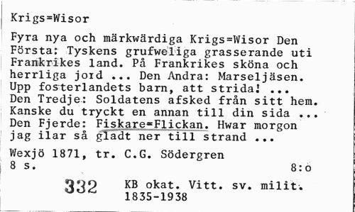//// Krigs=Wisor //// Fyra nya och märkwärdiga Krigs=Wisor Den Första: Tyskens grufweliga grasserande uti Frankrikes land. På Frankrikes sköna och herrliga joid ... Den Andra: Marseljäsen. Upp fosterlandets barn, att strida] ... Den Tredje: Soldatens afsked från sitt hem. Kanske du tryckt en annan till din sida ... Den Fjerde: Fiskare«Flickan. Hwar morgon jag ilar så gladt ner till strand ... //// Wexjö 1871, tr. C.G. Södergren 8 s. 8:0 //// KB okat. Vitt. sv. mil i t. //// 1835-1938 ////