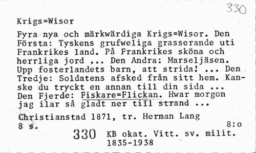 //// 330 //// Krigs=Wisor //// Fyra nya och märkwärdiga Krigs=Wisor. Den Första: Tyskens grufweliga grasserande uti Frankrikes land. På Frankrikes sköna och herrliga jord ... Den Andra: Marseljäsen. Upp fosterlandets barn, att stridai ... Den Tredje: Soldatens afsked från sitt hem. Kanske du tryckt en annan till din sida ... Den Fjerde: Fiskare=Fli ck an. Hwar morgon jag ilar så gladt ner till s-txand //// €hristianstad 1871, tr. Herman Lang 8 S. 8:o //// 330 KB okat. Vitt. sv. milit. //// 1835-1938 ////