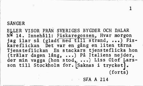 //// 1 //// SÅNGER //// ELLER VISOR FRÅN SVERIGES BYGDER OCH DALAR N» 14. Innehåll; Fiskaregossen, Hvar morgon jag ilar så (gladt ned till strand, ...) Fiskareflickan Det var en gång en liten tärna Tjensteflickan En stackars tjensteflicka hon (trälar dagen lång, ...) På Italiens nejder, der min vagga (hon stod, ...) Liss Olof Larsson till Stockholm for.(Saknas i trycketj. //// (forts) //// SVA A 214 7 ////
