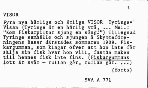 //// 1 //// VISOR //// Fyra nya härliga och ärliga VISOR Tyringe=' Visan (Tyringe är en härlig vrå, ... Mel.; "Kom Fiskarpiltar sjung en sång!") Tillegnad Tyringe samhälle och sjungen å Skytteföreningens Basar därstädes sommaren 1909. Fiskargumman, som klagar öfver att hon inte får sälja sin fisk hvar hon vill, fastän maken till hennes fisk inte fins. (Fiskargummans lott är svår - rullan går, rullan gar. 777) //// (forts) //// SVA A 771 ////