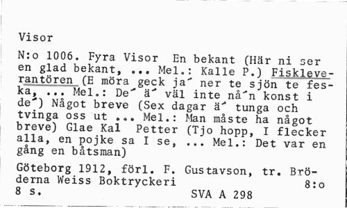 //// Visor //// N:o 1006. Fyra Visor En bekant (Här ni ser en glad bekant, ... Mel.: Kalle P.) Fiskleve-rantören (E möra geck ja" ner te sjön te fes-ka, ... Mel.: De"* ä" väl inte nå^n konst i de") Något breve (Sex dagar ä" tunga och tvinga oss ut ... Mel.: Man måste ha något breve) Glae Kal Petter (Tjo hopp, I flecker alla, en pojke sa I se, ... Mel.: Det var en gång en båtsman) //// Göteborg 1912, förl. F. Gustavson, tr. Bröderna Weiss Boktryckeri 8:0 8 s. SVA A 298 ////