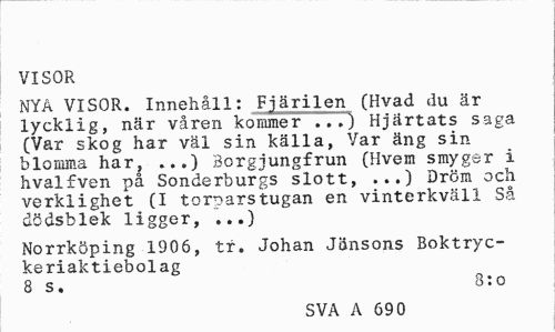 //// VISOR //// NYA VISOR. Innehåll: Fjärilen (Hvad du är lycklig, när våren kommer .77) Hjärtats saga (Var skog har väl sin källa, Var äng sin blomma har, ...) Borgjungfrun (Hvem smyger i hvalfven på Sonderburgs slott, ...) Dröm och verklighet (I torparstugan en vinterkväll Så dödsblek ligger, ...) //// Norrköping 1906, tr. Johan Jonsons Boktryckeriaktiebolag //// 8 s. 8:o //// SVA A 12 2 ////