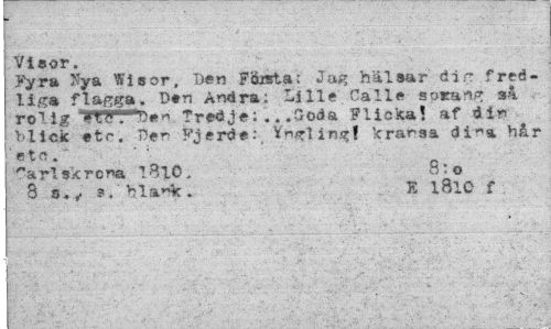 //// Visor. //// Fyra J?ya Wisor, Den F&ota: Jag hälsar dirt fredlig» flagga. Don Andra; Lille Calle sotat? så rolig HW.D*" Tredje:...Ooda Flicka! af dir blick etc. Der Fjerde:, Ynglingf kransa di "a hår ' etc." //// "ariskrona l3l0, 8:0 //// 8 o., b. hlank. K lBlC f ////