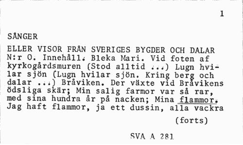 //// 1 //// SÅNGER //// ELLER VISOR FRÅN SVERIGES BYGDER OCH DALAR N:r 0. Innehåll; Bleka Mari. Vid foten af kyrkogårdsmuren (Stod alltid ;.*) Lugn hvilar sjön (Lugn hvilar sjön. Kring berg och dalar ..i) Bråviken. Der växte vid Bravikens ödsliga skär; Min salig farmor var så rar, med sina hundra år på nacken; Mina flammor* Jag haft flammor, ja ett dussin, alla vackra //// (forts) //// SVA A 281 ////