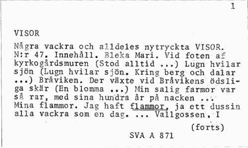 //// 1 //// VISOR //// Några vackra och alldeles nytryckta VISOR. N:r 47. Innehåll. Bleka Mari. Vid foten af kyrkogårdsmuren (Stod alltid ...) Lugn hvilar sjön (Lugn hvilar sjön. Kring berg och dalar ...) Bråviken. Der växte vid Bråvikens ödsliga skär (En blomma ...) Min salig farmor var så rar, med sina hundra år på nacken Mina flammor. Jag haft flammor, ja ett dussin alla vackra som en dag. ... Vallgossen» I //// (forts) //// SVA A 8 71 ////