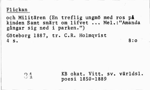//// Flickan //// och Militären (En treflig ungmö med ros på kinden Samt smärt om lifvet ... Mel.:"Amanda gångar sig ned i parken.") //// Göteborg 1887, tr. C.R. Holmqvist 4 s. 8:0 //// O 4 KB okat. Vitt. sv. världsl. //// ^ * poesi 1850-1889 ////