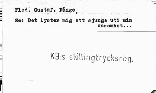 //// : Flod, Gustaf. Fånge^ //// 5 Se: Det lyster mig att sjunga uti min //// ensamhet... //// i KB. s skill i n g t r y eks reg. //// 1 ^nr ////