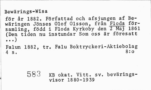//// Bewärings-Wisa //// för år 1882. Författad och afsjungen af Be-wäringen Jönses Olof Olsson, från Flöda församling, född i Flöda Kyrkoby den T"Maj 1861 (Den tiden nu instundar Som oss är föresatt //// Falun 1882, tr. Falu Boktryckeri-Aktiebolag 4 s. 8:o //// 583 //// KB okat. Vitt. sv. bevärings-visor 1880-1939 ////