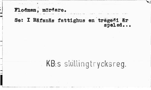 //// Flodman, mördare. //// Se: I Räfsnäs fattighus en trage*i är //// spelad.•• //// i i //// - KB:S skiUingtrycksreg. //// i //// i___ . ////