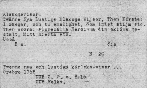 //// Älskogsviscr . //// Twiinre Nya Lustige El skogs Wi^sor, Then Första; I Skogar, och tu erslighet, 3om intet stijm etc. Ther Andra; Florebälla Ilerdimta din akiöna gestalt, Mitt hierta etc. Uooå //// 8 s. 8 ; o //// N . //// Twenne nya och lustiga kärleks-wiser ... Örebro 1768 //// UUB Z. ?„ s. 8:16 UUB Folkv. ////