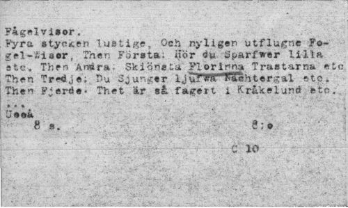 //// Fagwlvisor, //// Fyra stycken lustige, Och nyligen utflugne Fo-gel-Äissr t then För »ta: iiör du Sparfwer lilla etc. Then Åfflåra; 5ki.<5n«ta Fl or 1 nna Trastarna etc Then Tredje; t>u Sjunger 1 j uf Ä"1 "ttah t er g al etc. Then Fjerde• Thet är så fagert i Krakelund etc. //// g-». e;#> ////