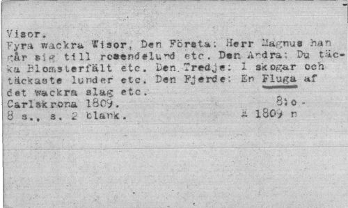 //// Visor. //// Fyra wacltra Wisor, Den Första: Herr Magnus han ftå.r sig till rosendelu^ etc. Dsn Andra; Du täcka Blomslerfält etc. Den. Tredje; 1 skogar och täckaste lund er etc. Sen Fjerde; En Fluga af det wacltra slag etc. //// Carls* rona 180C>. _ 8io- //// 8 s., 3. 2 blans. i l8C'> n ////