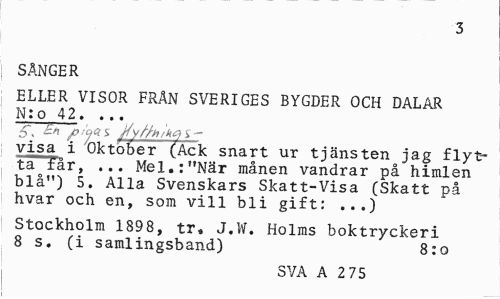 //// 3 //// SÅNGER //// ELLER VISOR FRÄN SVERIGES BYGDER OCH DALAR N:o 42. ... //// Tn f -yas ffytth/kc) i -visa i Oktober (Ack snart ur tjänsten jag flytta "får, ... Mel.:"När månen vandrar på himlen blå") 5. Alla Svenskars Skatt-Visa (Skatt på hvar och en, som vill bli gift: ...) //// Stockholm 1898, tr. J.W. Holms boktryckeri 8 s. (i samlingsband) 8:o //// SVA A 2 75 ////