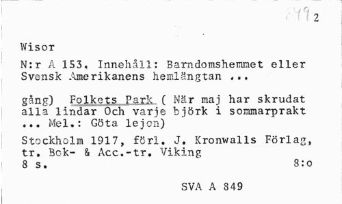 //// Ct/Q //// 2 //// Wisor //// N:r A 153, Innehåll: Barndomshemmet eller Svensk Amerikanens hemlängtan ,.. //// gång) Fqlkets Park ( När maj har skrudat alla lindar Och varje björk i soramarprakt ... Mel.: Göta lejon) //// Stockholm 1917, förl. J. Kronwalls Förlag, tr. Bok- & Acc.-tr. Viking 8 s. 3:o //// SVA A 2 75 ////