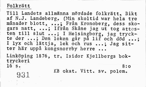 //// Folkrätt //// Till Landets allmänna mördade folkrätt.. Bikt af N.J. Landeberg. (Min skoltid war hela tre månader blott, Från Kronoberg, dess sko- //// gars natt, ...; Ifrån Skåne jag ut tog attesten till slut ...; I Helsingborg, jag tryckte der .Den leken går på lif och död I lyx och lättja, lek och rus Jag sit- //// ter här uppå kongsnorrby herre ... //// Linköping 1876, tr. Isidor Kjellbergs boktryckeri //// 16 s. 8:0 //// Q KB okat. Vitt. sv. polem. //// %j o -L ////