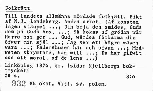 //// Folkrätt //// Till Landets allmänna mördade folkrätt. Bikt af N.J. Landeberg. Andra arket. (Af konsten ingen stämpel Din boja den smides, Guds //// dom på Guds hus, Så kokas af grödan wår //// Herre oss ger ... Gud, wärdes förbarma dig öfwer min själ ...; Jag ser ett högre wäsen wara ...; Fadershusen här och ofwan ...; Med-weten skrymtare, han will Du har gifwit //// oss ett moral, af de lena ...) //// Linköping 1876, tr. Isidor Kjellbergs boktryckeri //// 20 s. 8:0 //// 932 KB okat. Vitt. sv. polem. ////