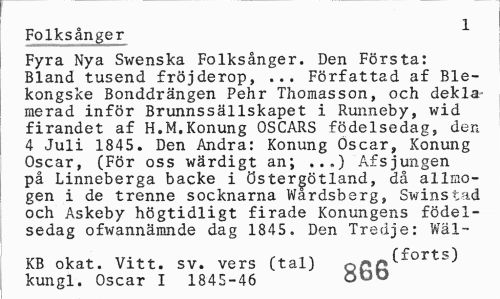 //// Folksånger 1 //// Fyra Nya Swenska Folksånger. Den Första: Bland tusend fröjderop, ... Författad af Ble-kongske Bonddrängen Pehr Thomasson, och deklamerad inför Brunnssällskapet i Runneby, wid firandet af H.M.Konung OSCARS födelsedag, den 4 Juli 1845. Den Andra: Konung Oscar, Konung Oscar, (För oss wärdigt an; ...) Afsjungen på Linneberga backe i Östergötland, då allaogen i de trenne socknarna Wardsberg, Swinstad och Askeby högtidligt firade Konungens födelsedag ofwannämnde dag 1845. Den Tredje: Wäl- //// KB okat. Vitt. sv. vers (tal) Qfifi^fortS^ kungl. Oscar I 1845-46 ÖOD ////