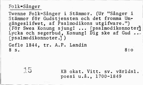 //// Folk-Sånger //// Twenne Folk=Sånger i Stämmor. (Ur "Sånger i Stämmor för Gudstjensten och det fromma Um~ gängeslifwet, af Psalmodikons utgifware.") (För Swea Konung sjung! ... [psalmodikonnoter^ Lycka och segerbud, KonungI Dig ske af Gud [psalmodikonnoter.] ) //// Gefle 1844, tr. A.P. Landin 8 s, 8:0 //// _ 5 KB okat. Vitt. sv. världsl. //// poesi u.å., 1700-1849 ////