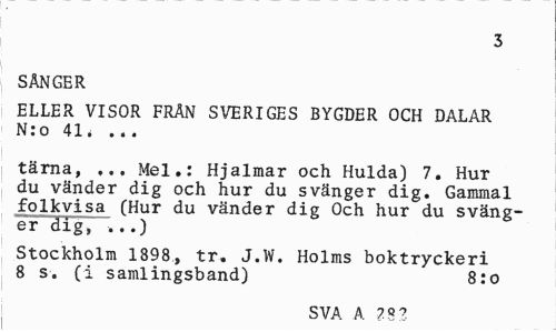 //// 3 //// SÅNGER //// ELLER VISOR FRÅN SVERIGES BYGDER OCH DALAR N:o 41 i ... //// tärna, ... Mel.: Hjalmar och Hulda) 7. Hur du vänder dig och hur du svänger dig. Gammal folkvisa (Hur du vänder dig Och hur du svänger dig, ...) //// Stockholm 1898, tr. J.W. Holms boktryckeri 8 s. (i samlingsband) 8:o //// SVA A 2 76 ////