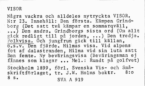 //// VISOR //// Några vackra och alldeles nytryckta VISOR. N;r 23. Innehåll: Den första. Kämpen Grindborg (Det satt två kämpar en sommarqväll, ...) Den andra. Grindborgs sista ord (Om allt gick redligt till på jorden, ...) Den tredje. Folkvisa. Och jungfrun gick till källan, o.s.v. Den fjärde. Hilmas visa. Vid alpens fot af dalastranden, Hilma vid sin luta satt Den femte. Ny beväringsvisa (Beväringsman ej finnes som klagar ... Mel.: Rundt på golfvet) //// Stockholm 1899, förl. Svenska Vis- och Småskriftförlaget, tr. J.W. Holms boktr. 8:0 //// 8 s* SVA A 919 ////