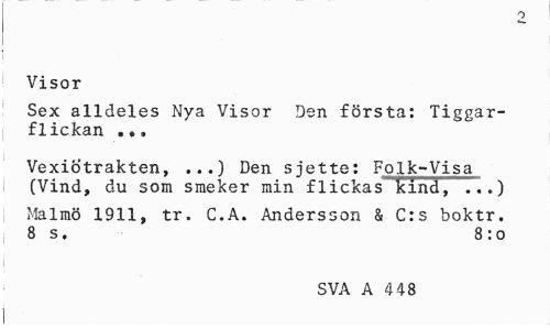 //// o //// Visor //// Sex alldeles Nya Visor Den första: Tiggarflickan //// Vexiotrakten, ...) Den sjette: Folk-Visa (Vind, du som smeker min flickas kind, ...) //// Malmö 1911, tr. C.A. Andersson & C:s boktr. 8 s. 8:0 //// SVA A 448 ////