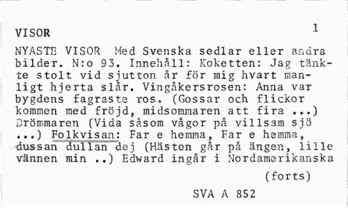 //// VISOR 1 //// NYASTE VISOR Med Svenska sedlar eller andra bilder. N:o 93. Innehåll: Koketten: Jag tänkte stolt vid sjutton år för mig hvart manligt hjerta slår. Vingåkersrosen: Anna var bygdens fagraste ros. (Gossar och flickor kommen med fröjd, midsommaren att fira ...) Drömmaren (Vida såsom vågor på villsam sjö ...) Folkvisan: Far e hemma, Far e hemma, dussan dullan dej (Hästen går på ängen, lille vännen min ..) Edward ingår i Nordamerikanska //// (forts) //// SVA A 852 ////