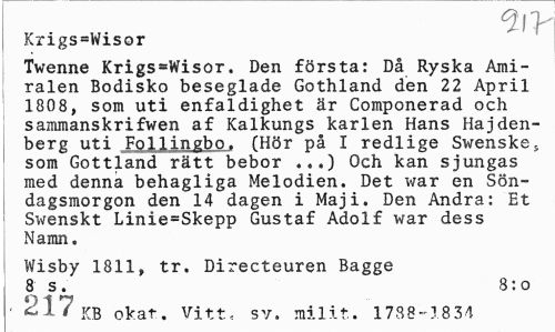 //// m- //// Krigs=Wisor //// Twenne Krigs^Wisor. Den första: Då Ryska Amiralen Bodisko beseglade Gothland den 22 April 1808, som uti enfaldighet är Componerad och sammanskrifwen af Kalkungs karlen Hans Hajden-berg uti Foljingbo. (Hör på I redlige Swenske, som Gottland rätt bebor ...) Och kan sjungas med denna behagliga Melodien. Det war en Söndagsmorgon den 14 dagen i Maj i. Den Andra: Et Swenskt Linie=Skepp Gustaf Adolf war dess Namn. //// Wisby 1811, tr. Directeuren Bagge //// 8; s. 8: o //// ' 217 KB okat. Vitt, sv. milit. 1788-1834 ////